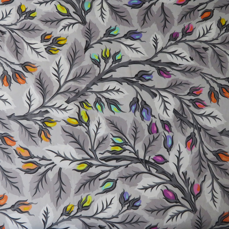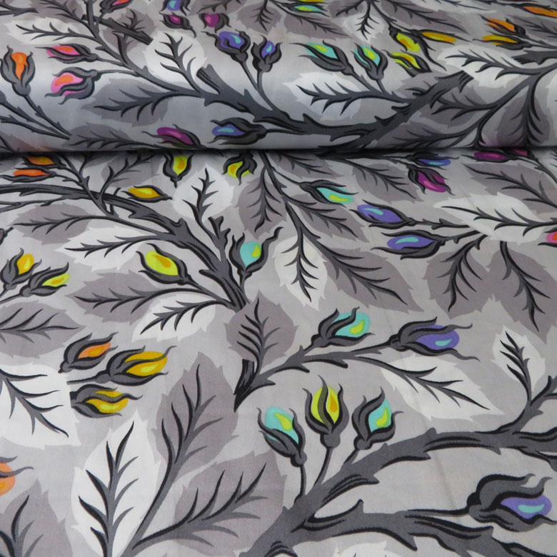 Item Description: Graywork Wideback in Fog offers a dramatic option for quilt backings. With its rich shadow gray leafy pattern accented by colourful pops, this 108″ extra-wide fabric is perfect for seamless quilt finishes. Premium Free Spirit quilting sateen finish cotton, 108″ wide.