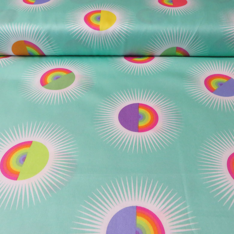 Item Description :Tula Pink Daydream- Saturdaze in the tall grass behind me lurked a family of rainbow Jaguars that sparkled like constellations under a full moon. A panorama of tiny rainbows lit up the sky and reminded me of the magic that hap-pens when the sun meets the rain.Sateen Cotton for a super soft backing.