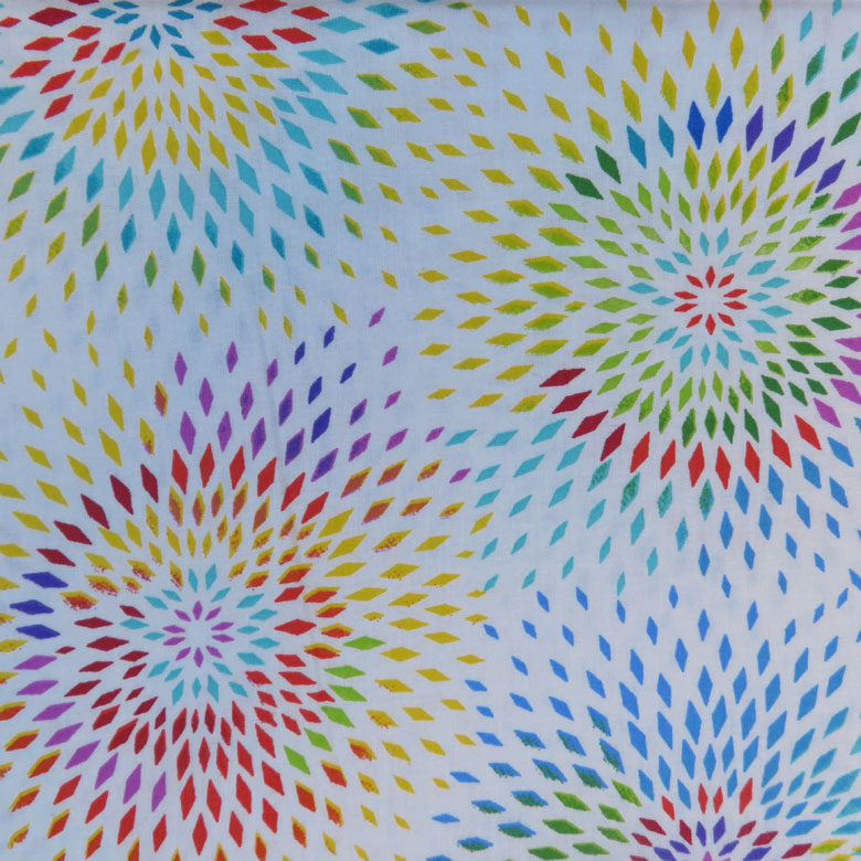 Item Description: Radiance a fun backing fabric. This is an excellent quality 100% cotton backing fabric by Henry Glass & Co, featuring a circular burst pattern in colourful colours, on a white background.