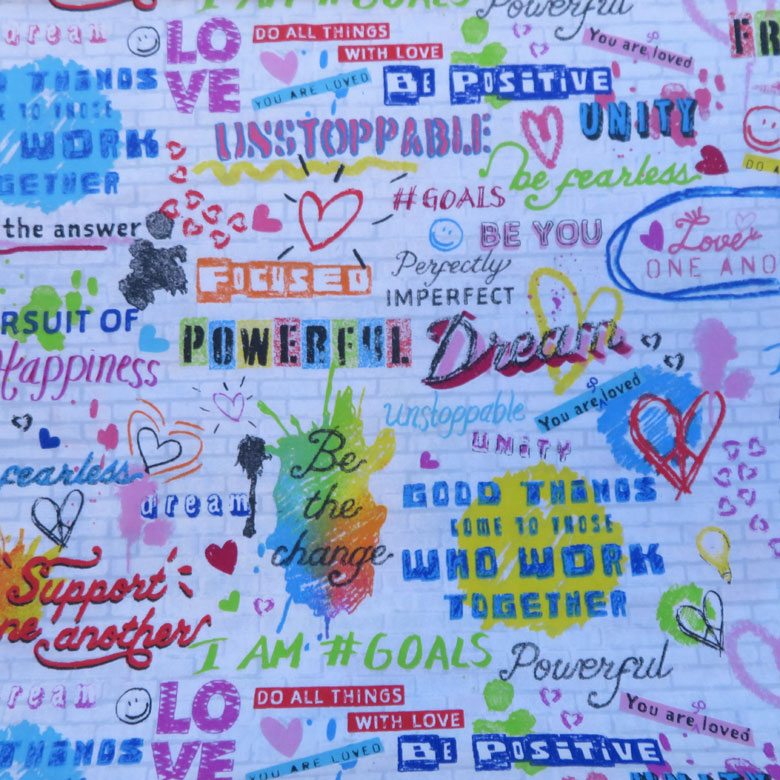 Item Description:  Fun backing wide width fabric. Colourful play of bright abstract encouraging words. Add a little fun on your quilt backs.